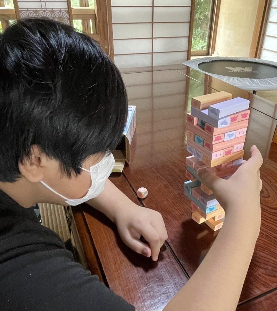 『シュッと抜いてサッと置く‼ 』AMくんより伝授されたジェンガの極意。自分を信じて、ここぞ!と決めたら一気に行く。ほんの数秒の瞬間にも人生訓がありました。