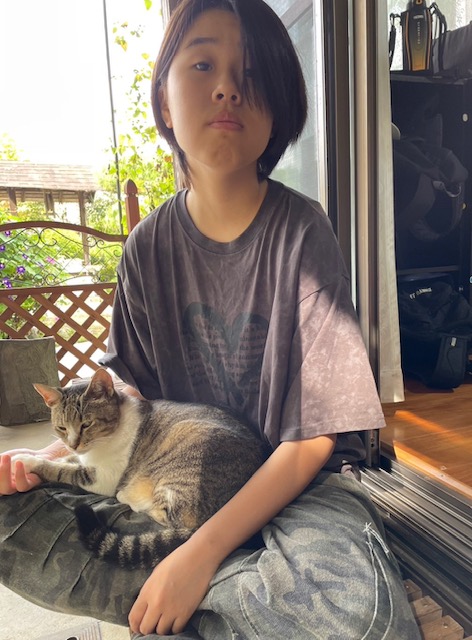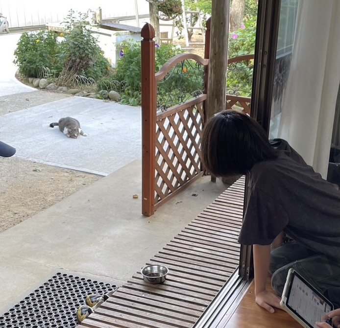 実は、家主さんとわんこのポポちゃんはおでかけ中で、ひとりでお留守番のにゃんちゅう。ごはんをもらって、Tちゃんにすっかり甘えています。