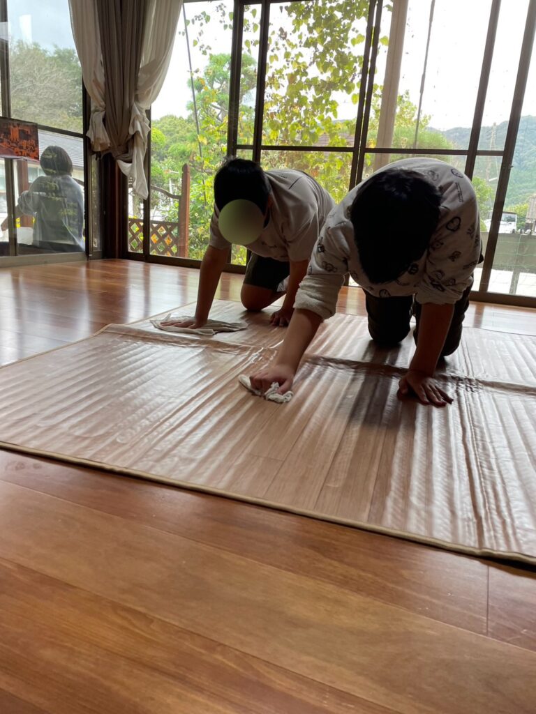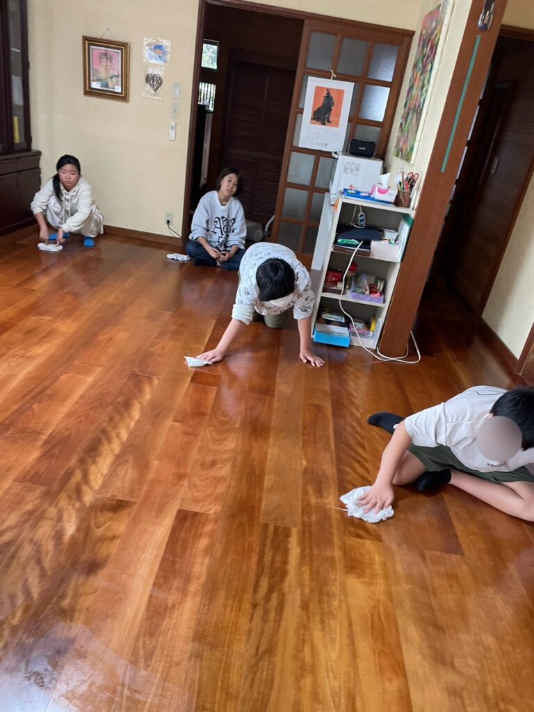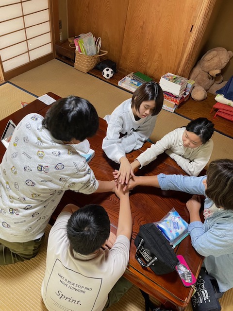 ひと働きした後は、みんなで一緒にクイズにゲーム。一番のもり上がりは「手!ピシッ!!」(えーぽいんと名称 笑)。リズムに合わせてみんなでかけ声、手を交互に重ねていって、かけ声が終わったとき、一番下の人がすばやく上の手をピシッ!!。反射神経が試されます。音楽室ではドラムとギター、今週末のご招待ライブで販売するグッズの制作、中学生は学習もしっかり取り組みましたよ!