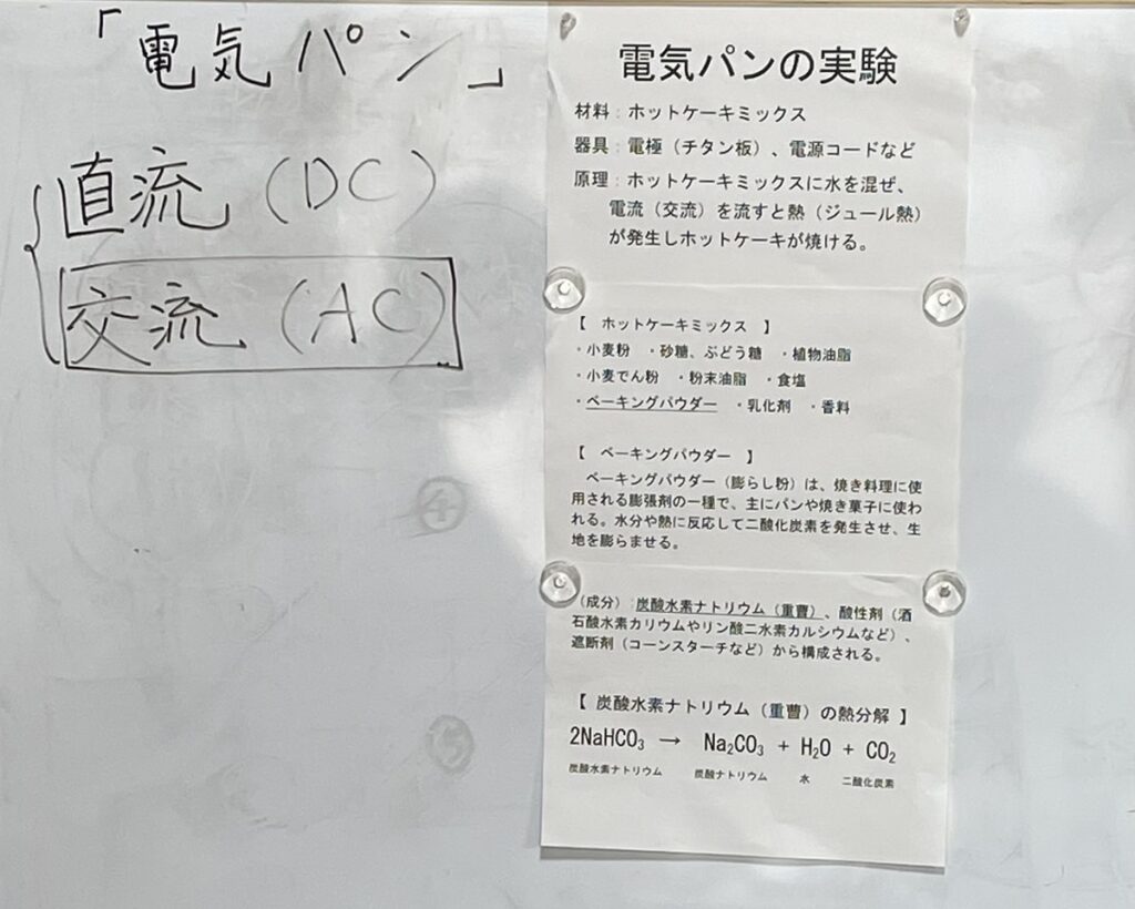 おー!!!ほんとにできました。パンというより、ケーキのスポンジみたいな感じです。パン生地の中に水分や塩分があるため電気が通り、通電するとジュール熱が発生して、内側からふくらむように焼けるんだって。ふくらむ理由も一緒に教わったよ。「炭酸水素ナトリウムの熱分解」、まさに料理も科学のかたまりでした。