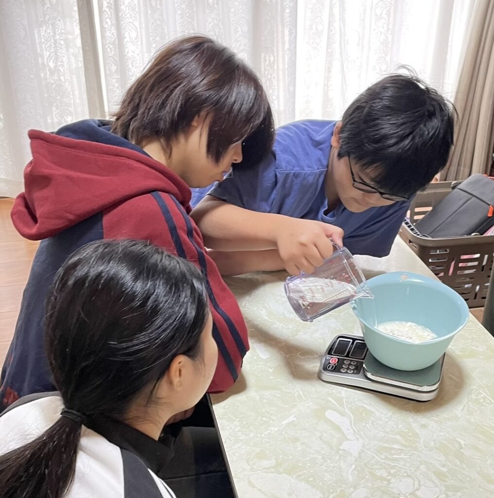 パンづくりのポイントは計量。粉も水もていねいに計って、だまを作らないようにコネコネしました。型に流し込んで、いざ通電!!どんな変化がおこるのか、目を離さないでよーく観察します。