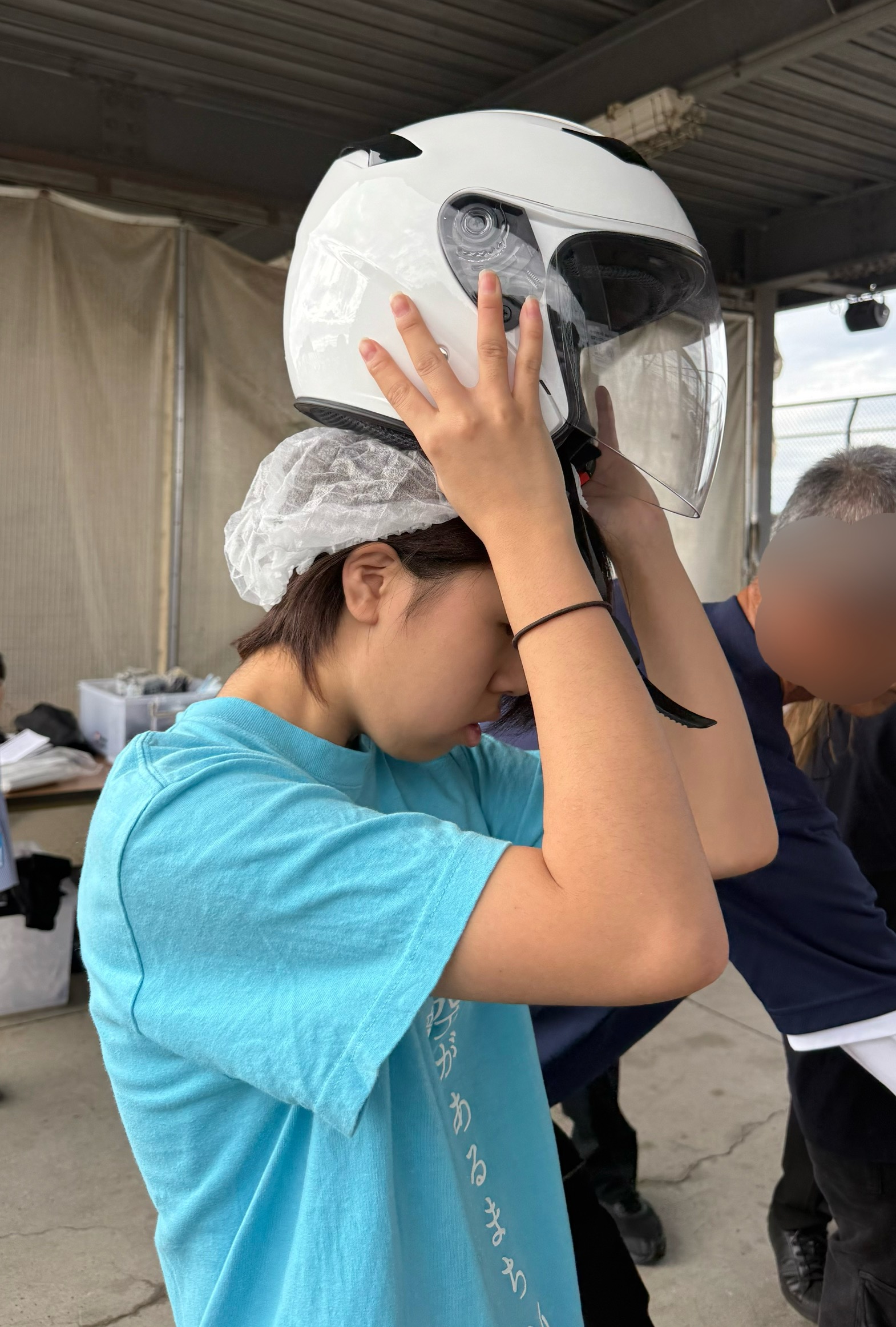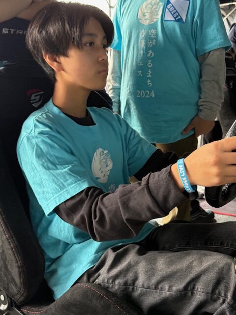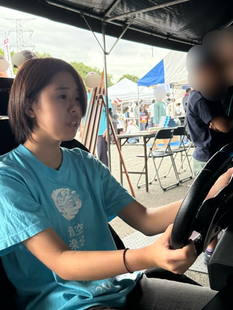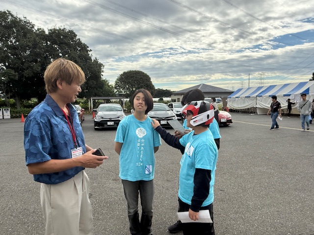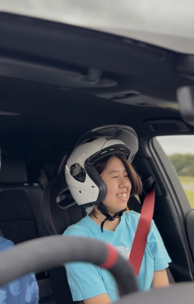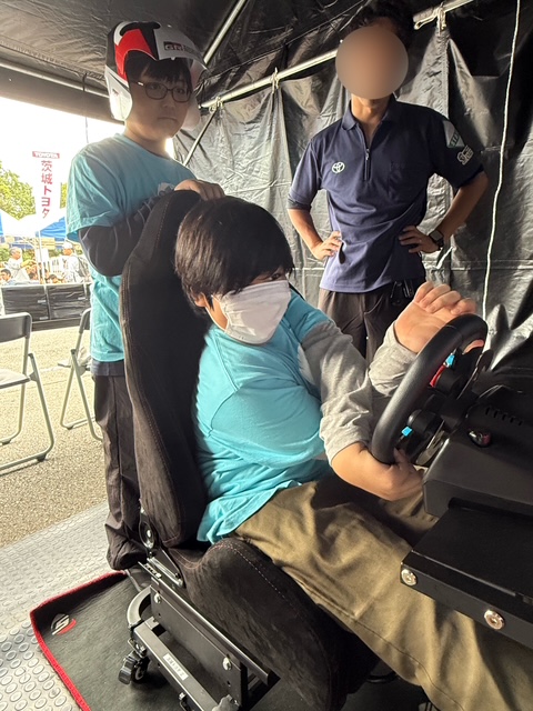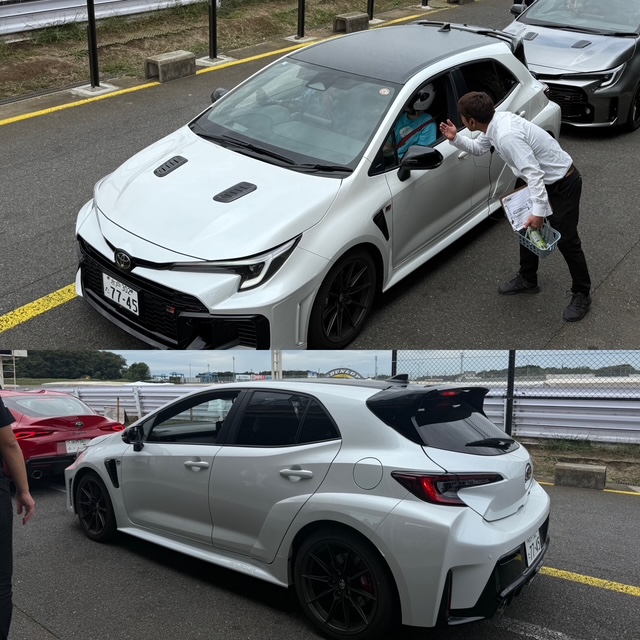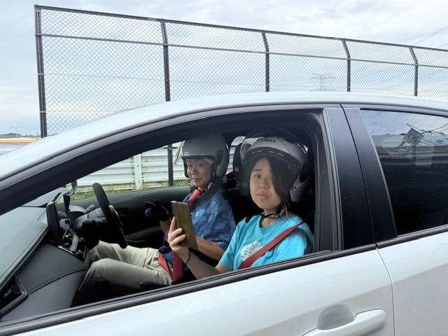 理事長のドライビングサポートには、Tちゃんが選出されました。ヘルメットをかぶって、GRカローラのコックピットにIN。二人ともやや緊張の面持ちです。