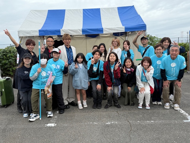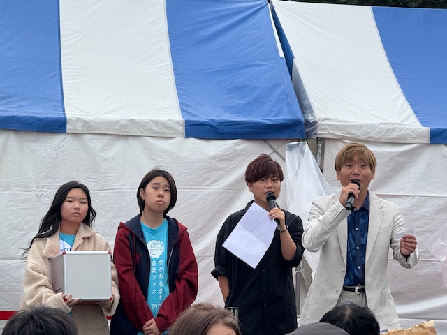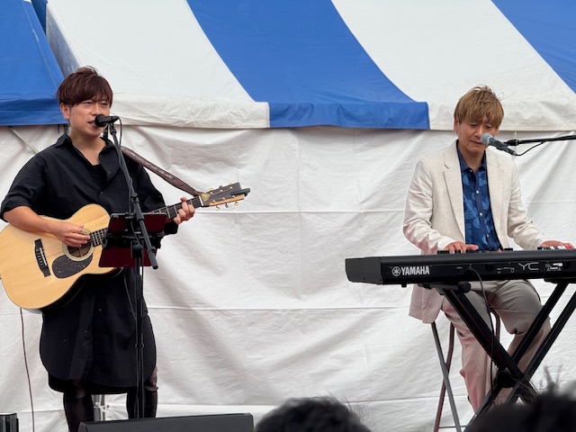 そして、今日のメインのマシコ理事長と磯山監事のライブです。雨がポツポツ落ちてきましたが、ライブの熱気で吹きとばそうと、スタッフ総出で「ワイパー!!」しました。(写真はありませんが、ワイバーとは。曲にあわせて両手をあげて左右に大きく振るパフォーマンスです。)