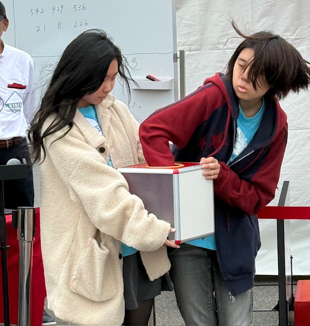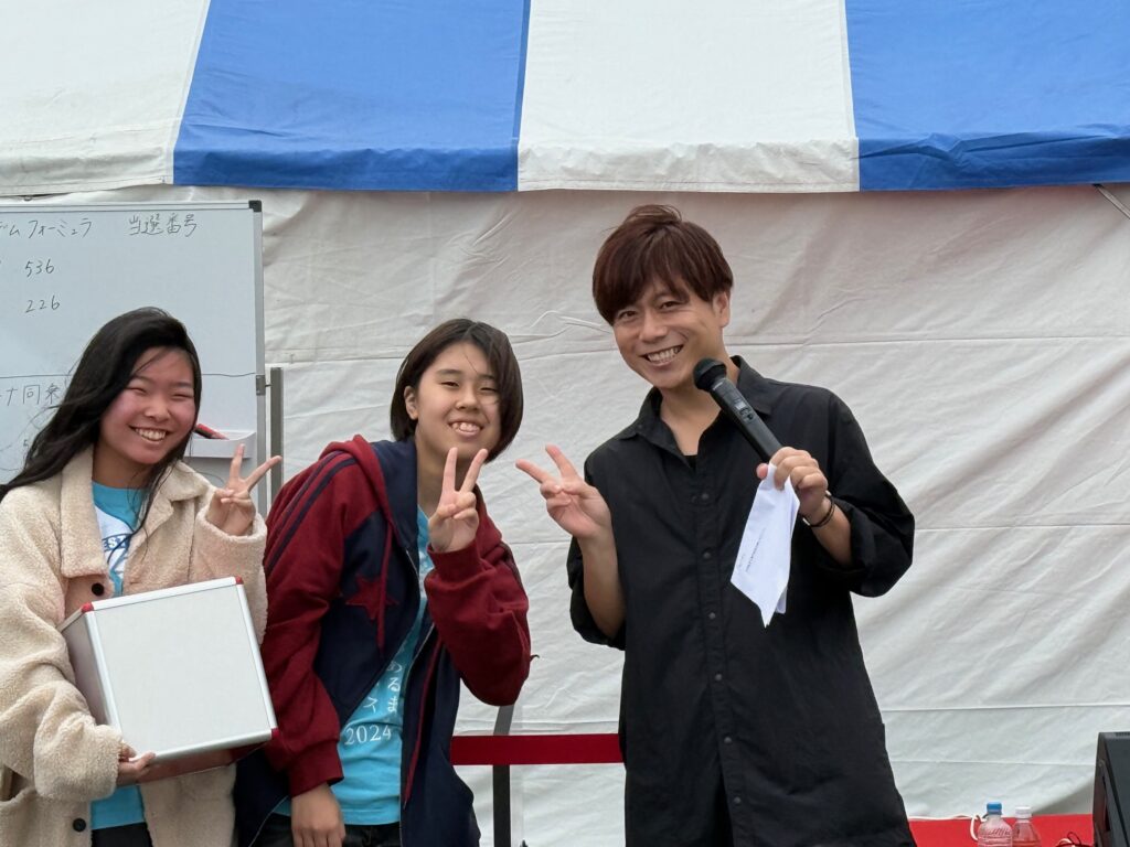 中学生ガールズは、理事長たちと大抽選会のお手伝いも。会場中の視線が集まる中、くじを引く大役ですが、可愛くピースも忘れません。(笑)