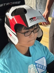 理事長のドライビングサポートには、Tちゃんが選出されました。ヘルメットをかぶって、GRカローラのコックピットにIN。二人ともやや緊張の面持ちです。