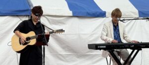 そして、今日のメインのマシコ理事長と磯山監事のライブです。雨がポツポツ落ちてきましたが、ライブの熱気で吹きとばそうと、スタッフ総出で「ワイパー!!」しました。(写真はありませんが、ワイバーとは。曲にあわせて両手をあげて左右に大きく振るパフォーマンスです。)