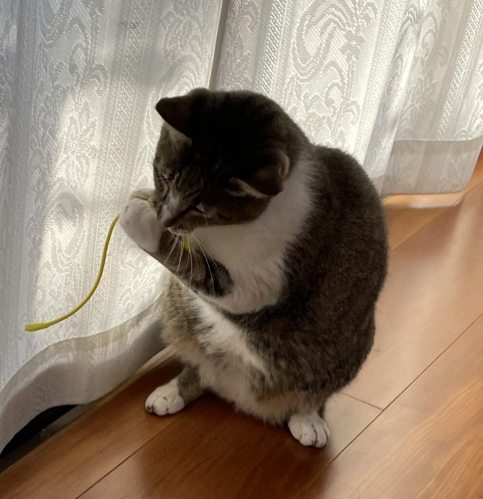 部屋に戻ると、にゃんちゅうがいたずらの真っ最中。グッズ用の手芸リボンを引っ張り出してきちゃいました。にゃんちゅうはひも状のものが大好き。Hちゃんとミニ綱引きで勝負です!!全身で戦うにゃんちゅう!あれ?このポーズ、どこかで見たような??