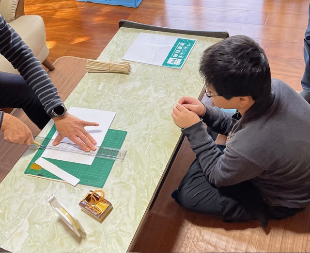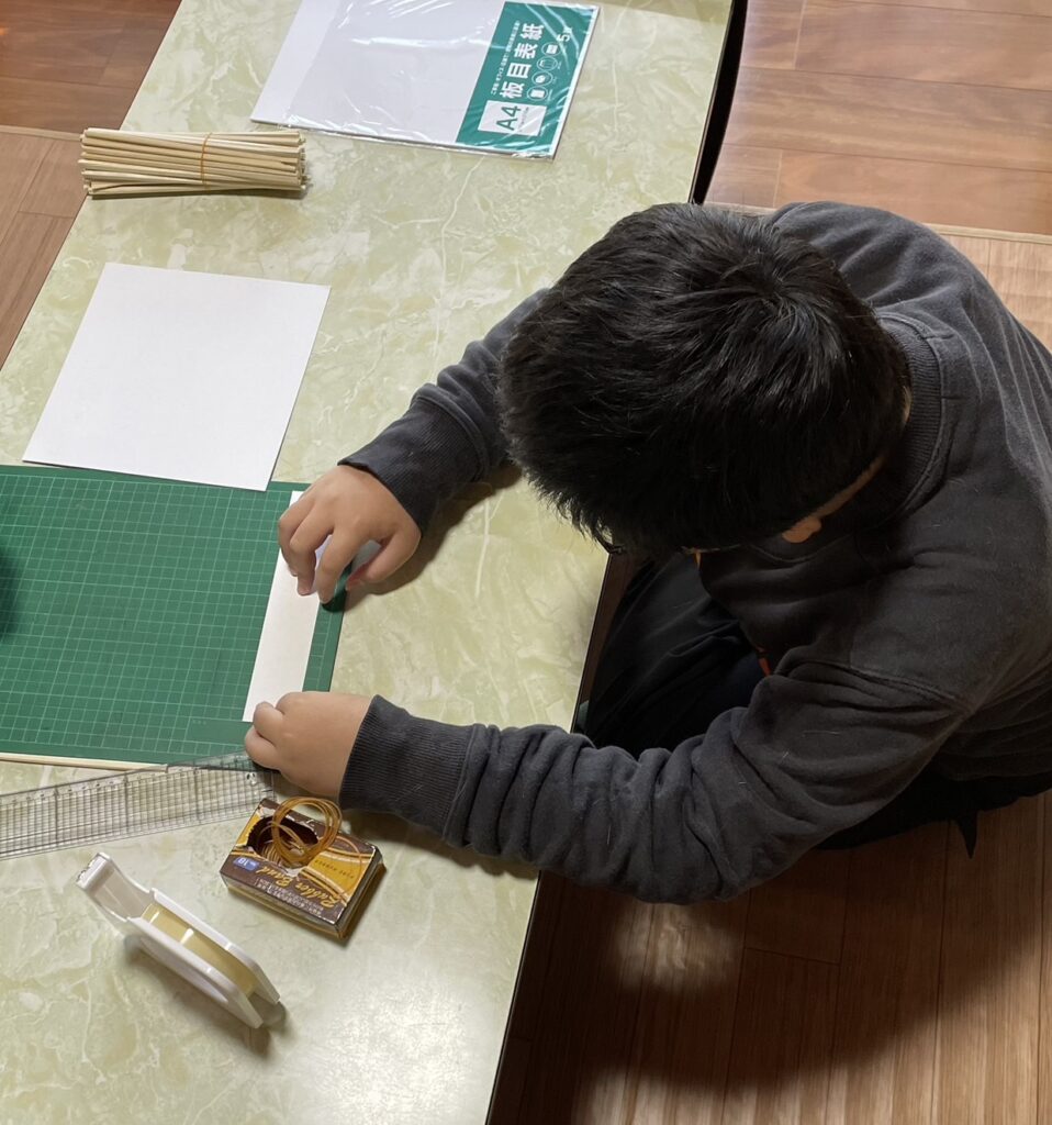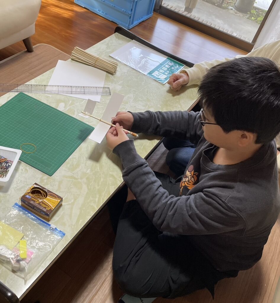 厚紙と割りばしで紙飛行機づくり。ポイントは翼のバランス。軸になる割りばしを、翼のちょうど真ん中につけられるようにきちんと計って決めます。