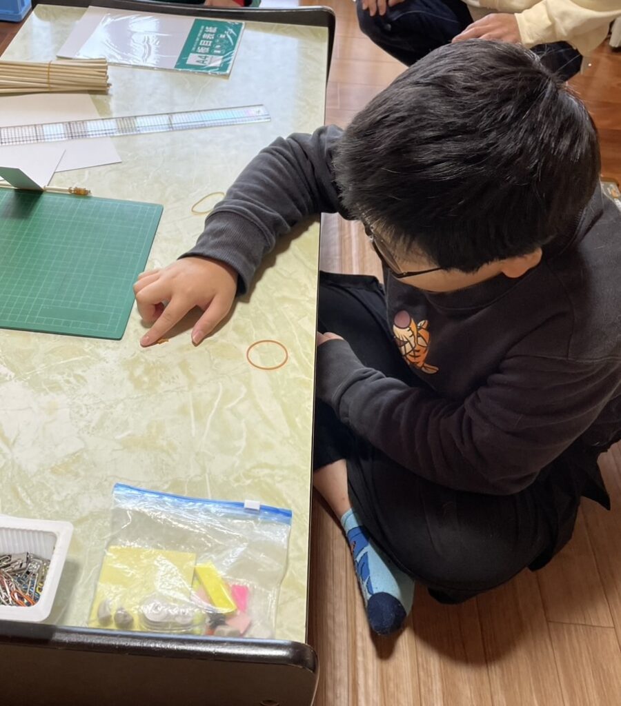 手でクルクルまとめた輪ゴムをテーブルに置いてじっと待ちます。。が、からまってしまって残念ながらもどりません(笑)ゴムの中は、とっても細かい「ひも」みたいな分子がたくさんつながってできていて、そのひもは普段はくねくね曲がってからまっているんだって。それを引っ張ると「ピン」とまっすぐの伸びるけど、手を離すともとのくねくねに戻ろうとする、この力が「弾性」。ゴムが伸びたり縮んだりするのは当たり前だと思ってたけど、ちゃんとしくみがあったんだね。