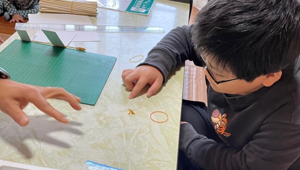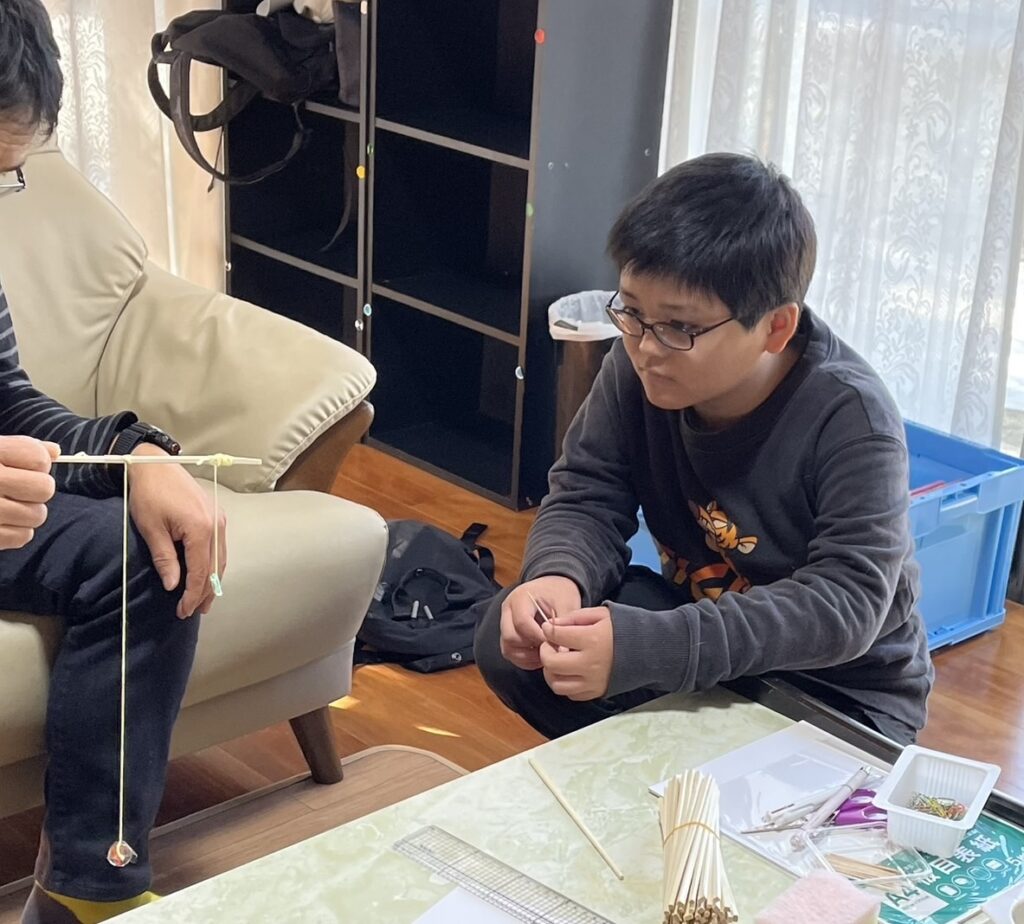 3つめは「振り子の法則」の実験。Kティーチャーが長い振り子と短い振り子を作ってくれて、揺らしてみたら、長い方はゆらゆらゆっくり、短い方はちょこちょこ早く揺れたよ。