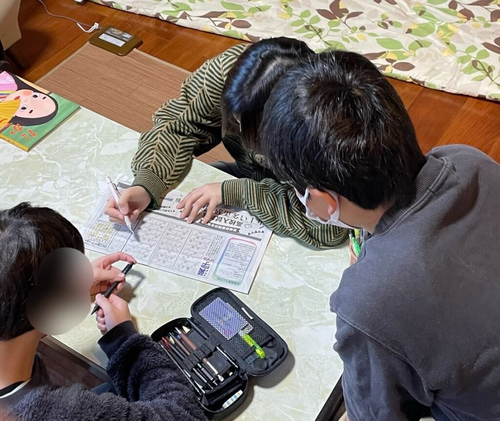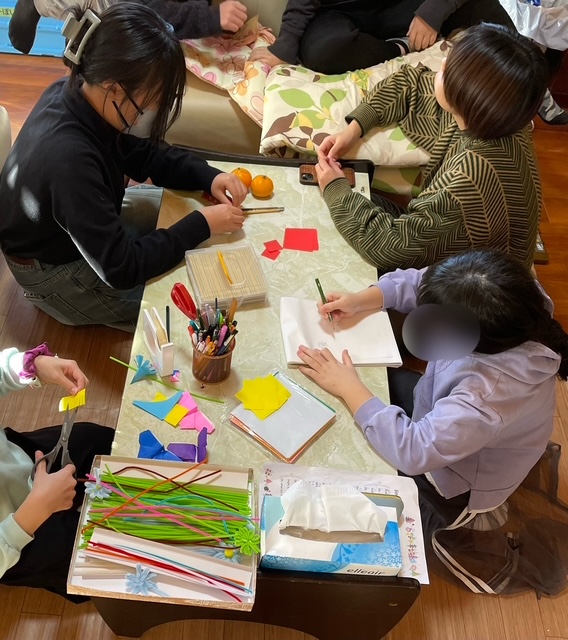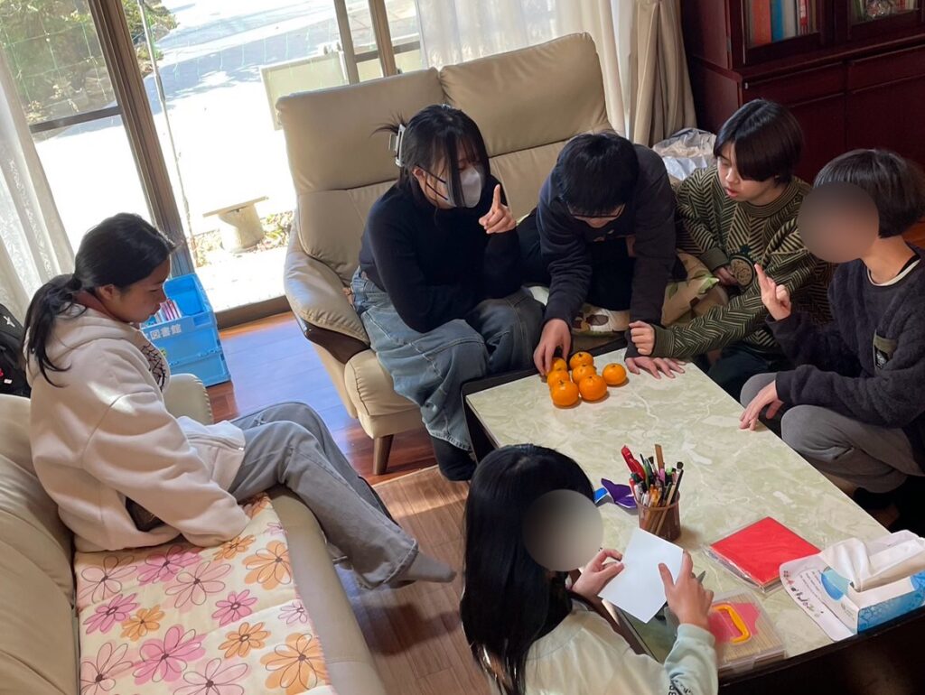 えーぽいんとにはいわゆる「教室」はありません。ここは理事長ご実家、ごく一般的なおうちです。普段過ごすスペースは14畳くらいの洋室と10畳くらいの和室で、そのほかに、自慢の音楽室とか、ひとりになれる小部屋(相談室)とかがあります。洋室には、ちょっと大きなソファーとほどよい大きさのテーブルがあって、今日もそのテーブルがにぎやかです。