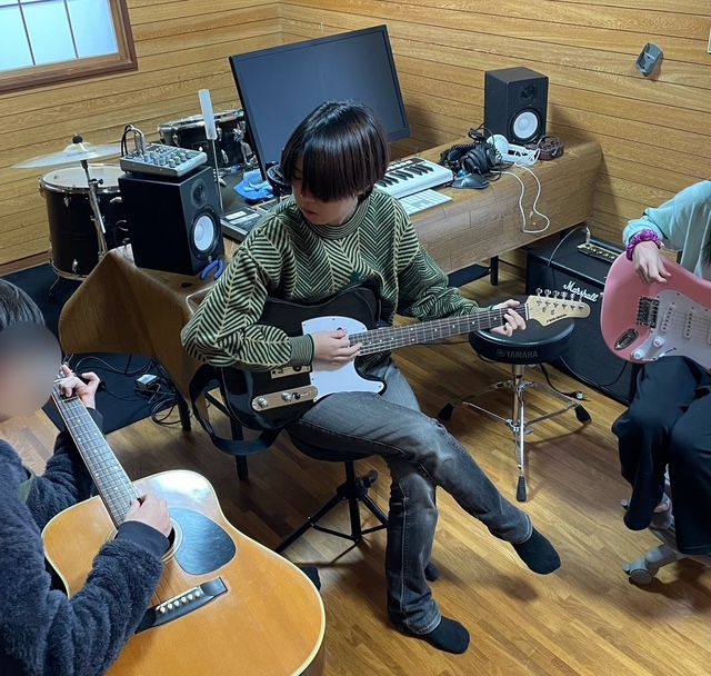 ところで、今日の体験ガールも音楽が好きな様子。さっそくギターに挑戦してくれました。Tちゃん、Sくんが講師です。楽しんでくれたようでうれしかったね。