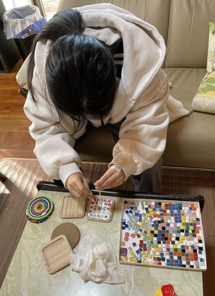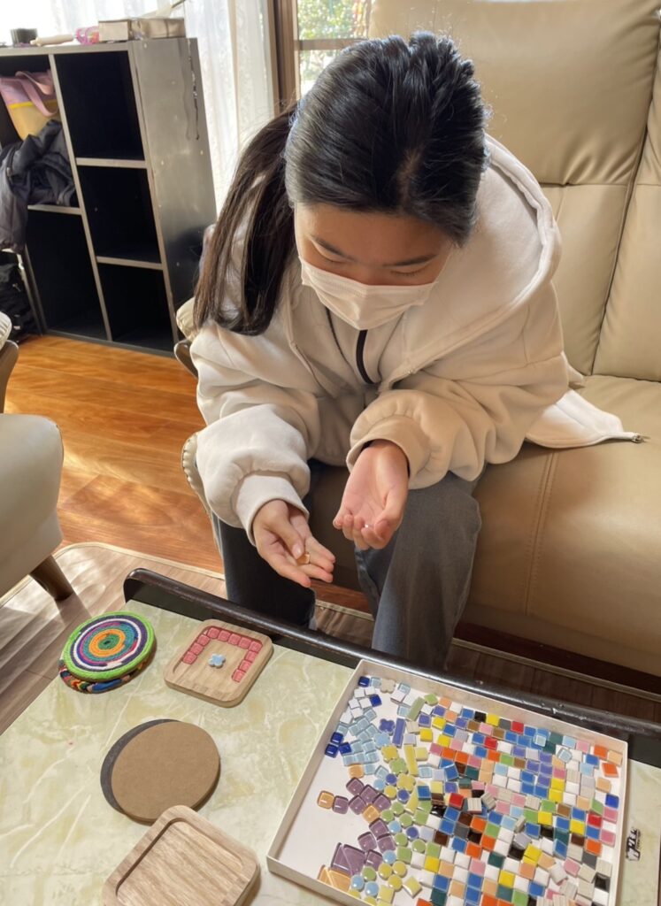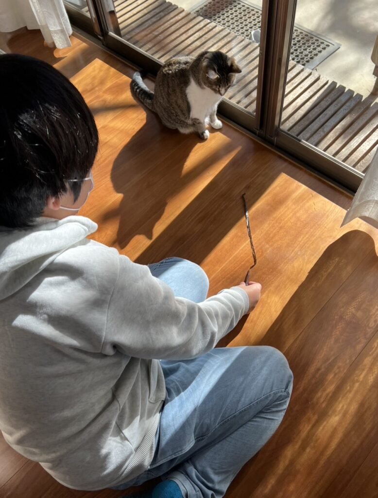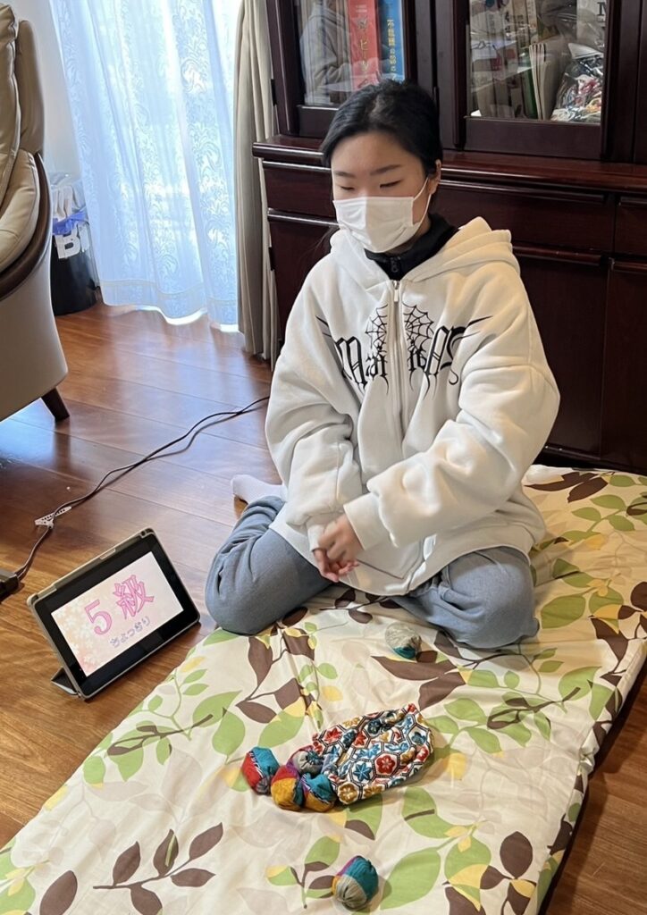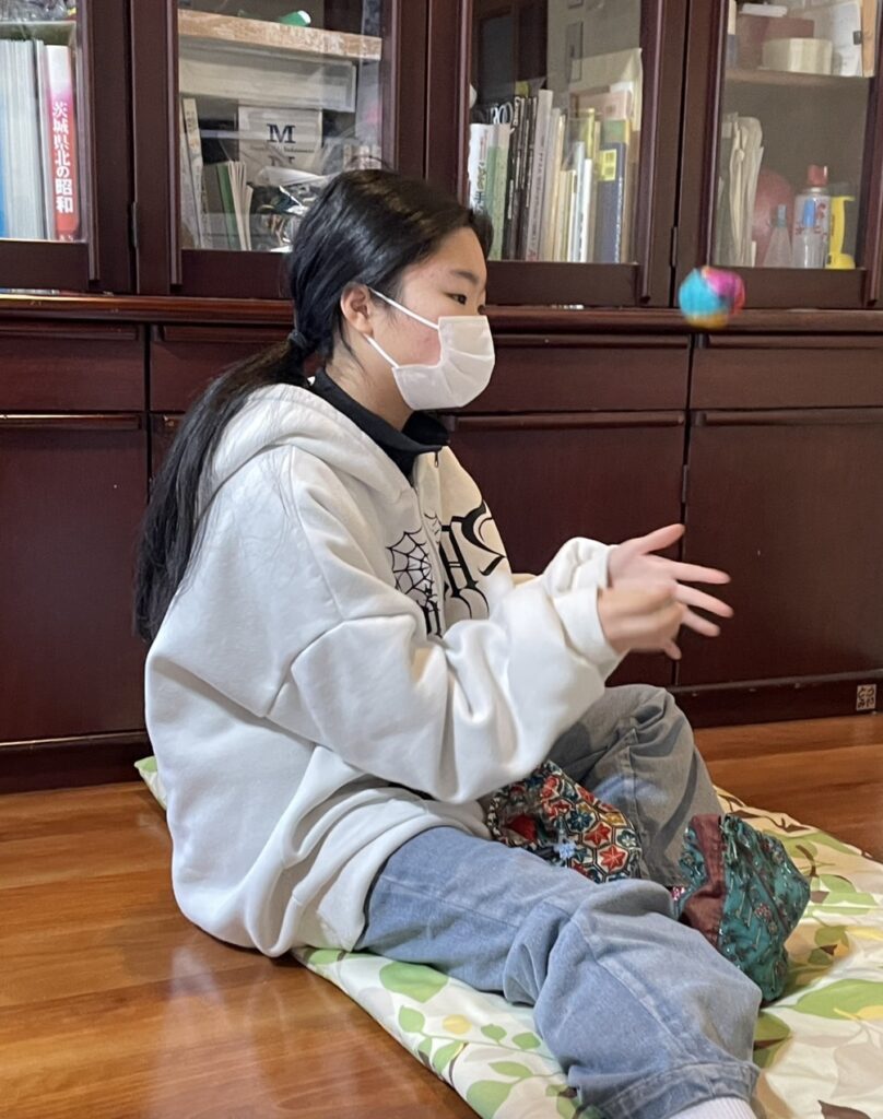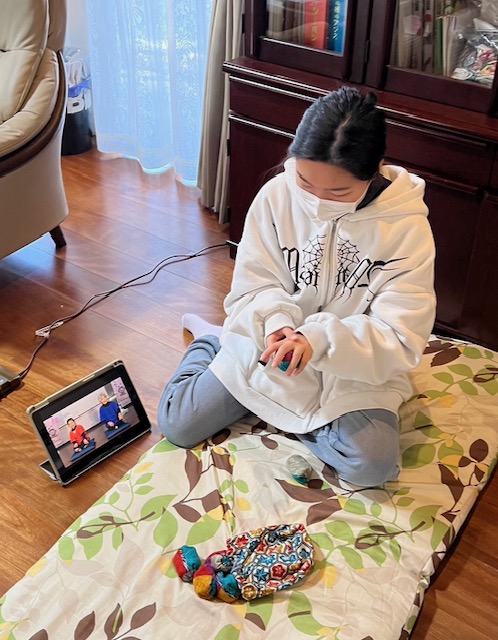 Hちゃんは、お手玉に挑戦しました。今はなんでもYouTubeにレクチャーしてもらえます。最初は、上に投げるコツがつかめず、お手玉があっちこっちになってしまい「取るのがむずかしい~~。」でしたが、ダンスが得意なHちゃん、持ち前のリズム感で技をひとつひとつクリア!次はみんなにも見せてみない??
