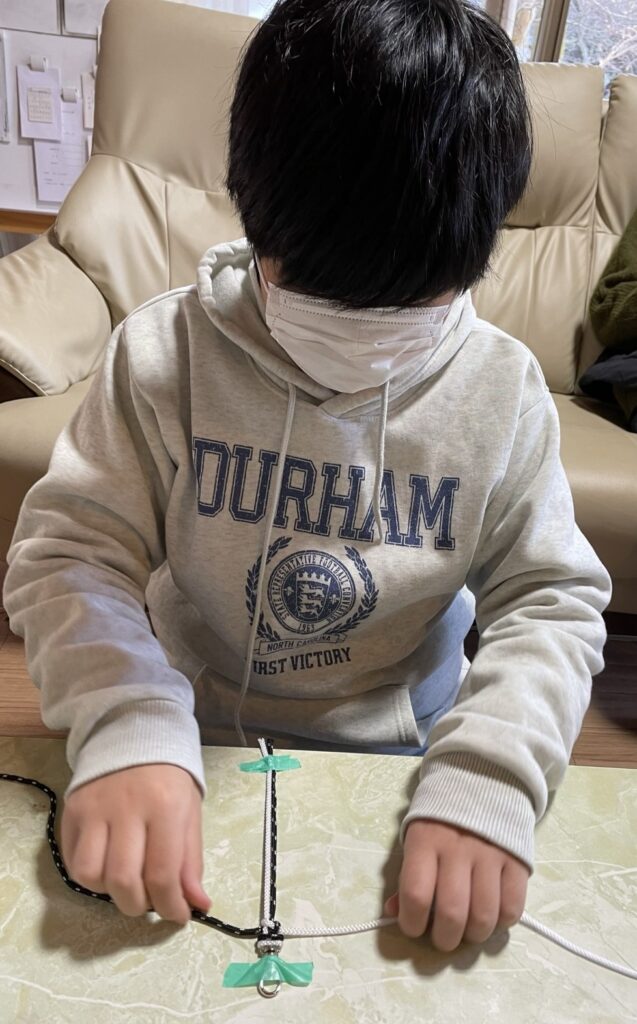 ストラップをまっすぐ仕上げるには、力の入れ加減を工夫する必要があります。KAくんはそこのところが上手い!そして集中力といえば、こちらも得意!