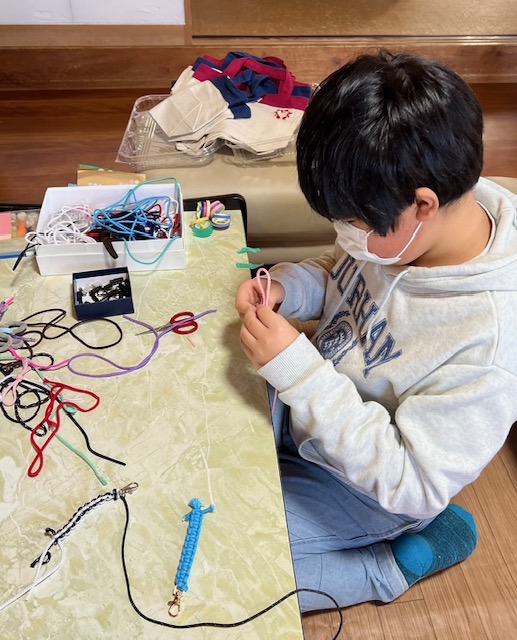 KAくんは、基本インドアのじっくり派。来月のえーぽいんとライブはちょっとビッグになるかも!しれないので、グッズづくりはみんなの命題です。KAくんお得意のマクラメ編のストラップづくりをすすめてくれました。(カラフルなストラップはわたしも愛用中!)熱中!集中!!でどんどん仕上げるKAくんです。