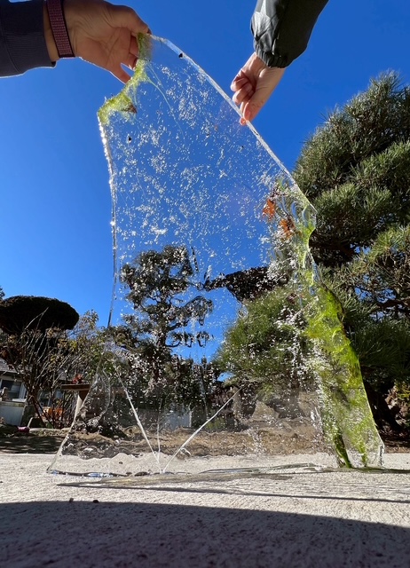 今日も池は凍っていました。IAくん、ためしに池の氷に片足をのせてみると、意外に強固な感触。。氷を引き上げてみました。氷をつかむ指がじんじん冷たくて痛いくらいです。