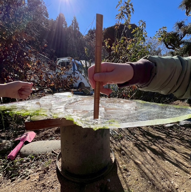 試しに厚さを計ってみたら、一番厚いところでは2㎝近くありました。これならにゃんちゅうは乗れたかも?!。寒さが目に見えちゃったなぁ。