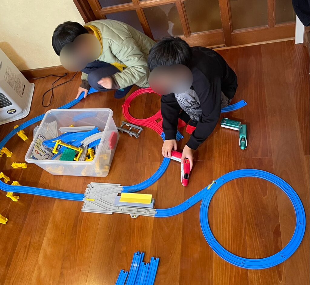 お天気はよかったのですが、外はやっぱりなかなかの寒さ、今日は室内で思い思いに過ごしました。メインは「おもちゃ遊び」の3連発。まずはこちら、体験ボーイズたちのプラレール。