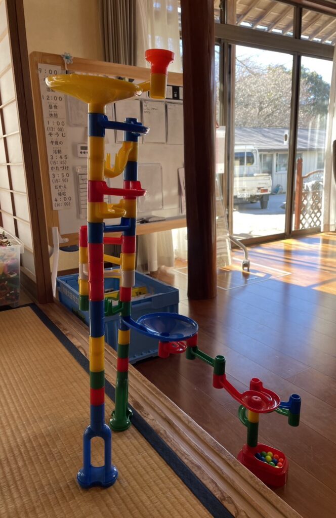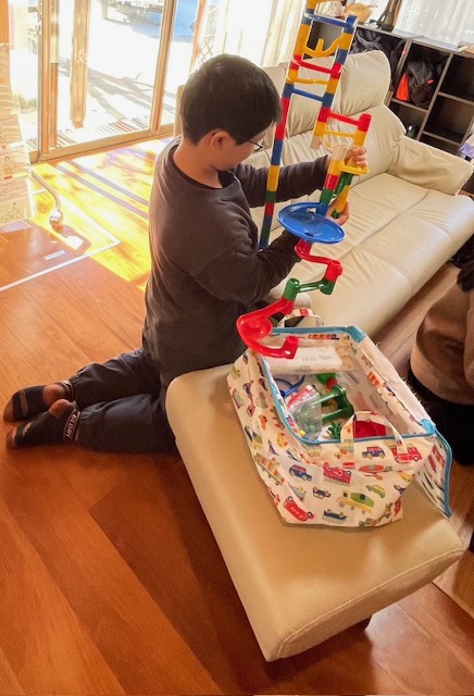 IAくんは、久々のコロコロスロープづくり。(popoはこのおもちゃの名前をはじめて知りました‼)部品をフルに使って大きなスロープが完成。和室とリビングの段差もうまーく使えています。かっこいいね!