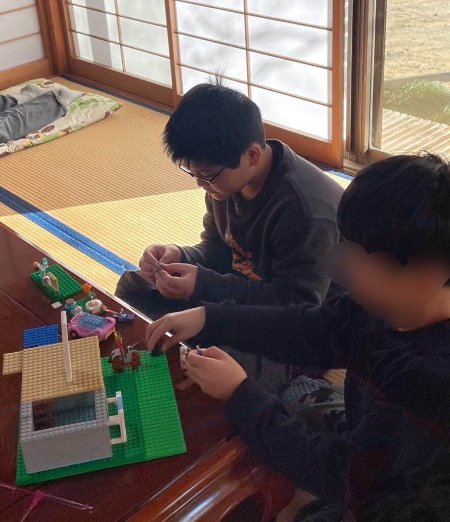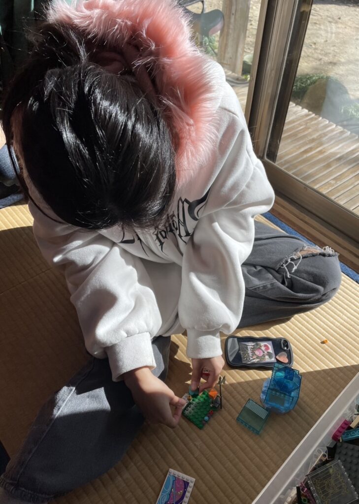 そして、みんなでLEGO。今日のテーマはなんでしょう?Hちゃんの小さな作品に立っているのは、門番なのかな?!。みんな自分の世界に没頭していました。太陽の低い冬は、和室におひさまがいっぱいです。