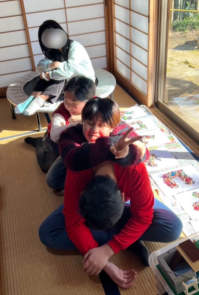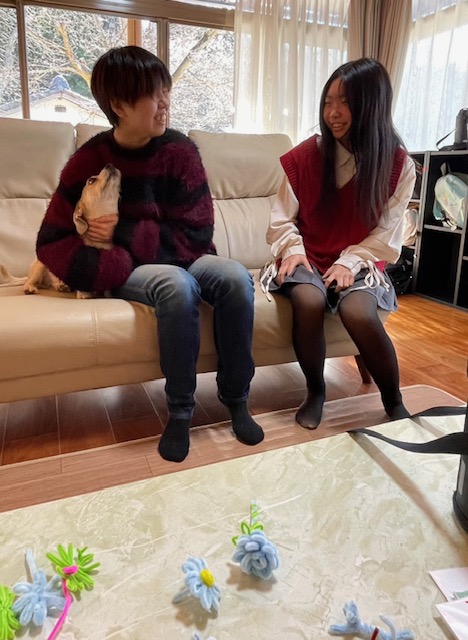 さて、小学生が元気に駆け回っているころ、中学生のお姉さまたち(笑)はというと、二人で暖かい部屋の中、ぽぽちゃんを抱いておしゃべりに夢中でした。見るからに楽しそう!