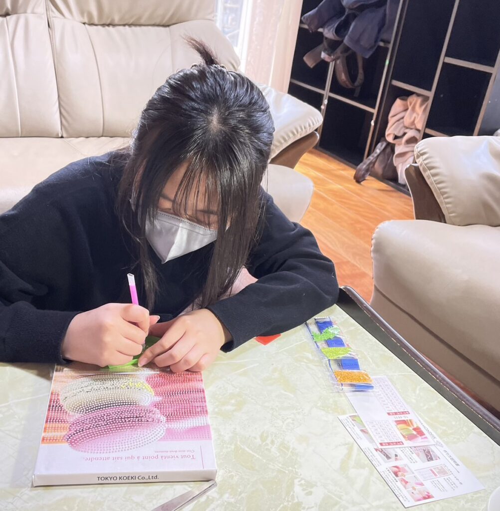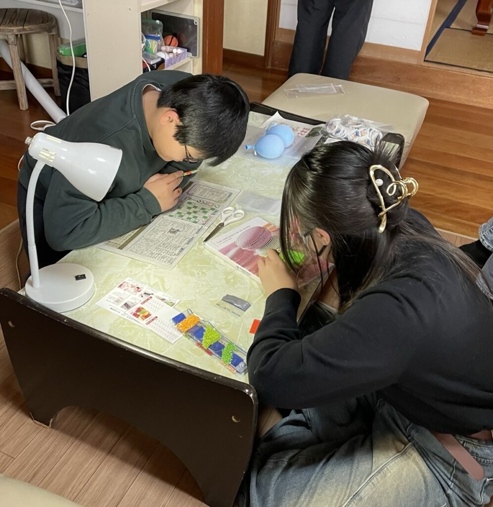 今日は小学生2人、中学生1人のえーぽいんたーたち。作業のあとは、クロスワード、iPadで調べべもの、中学生女子KOちゃんもビーズ貼り絵が楽しくて、日がな一日細かい作業に取り組んでいました。
