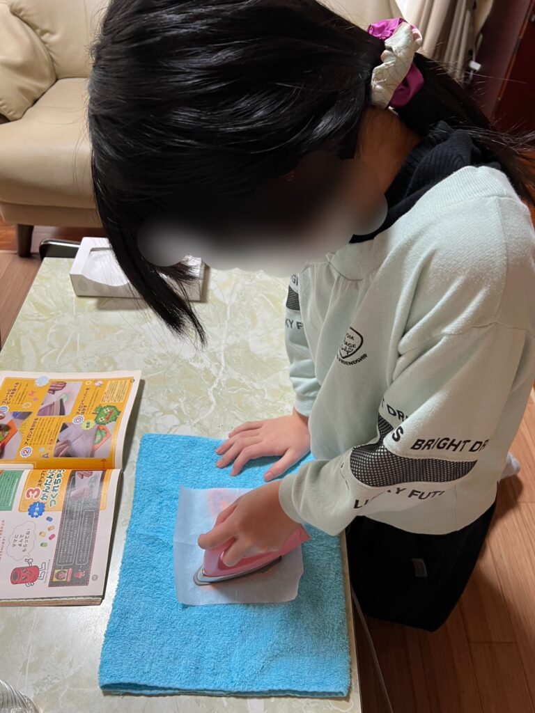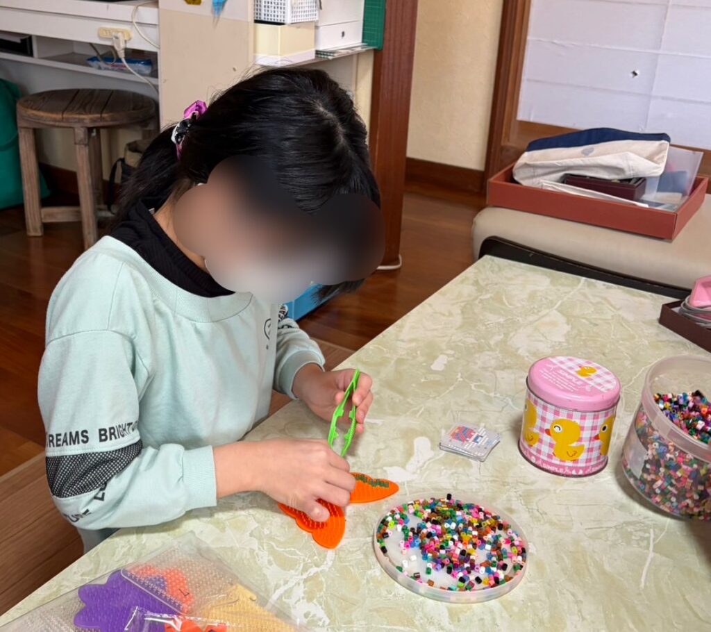 Sちゃんお得意の手芸からスタート。今日はアイロンビーズに挑戦です。アイロンビーズは、プラスチックの色とりどりの小さなビーズを専用のプレートに並べて、上からアイロンの熱を当てるとビーズが少し溶けてくっついて作品になります。