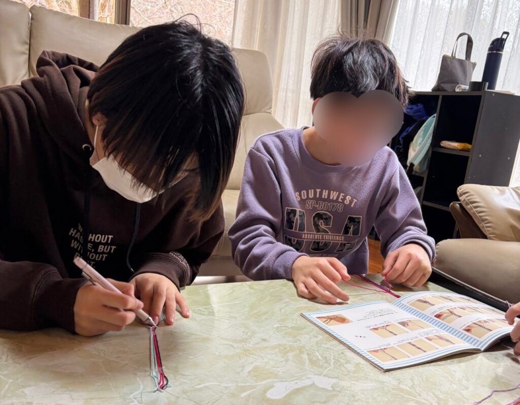 材料は刺繍糸、1本1m✖6本を編み上げていきます。テーブルに糸をならべてテープで固定して、柄をイメージしながら糸を重ねていくのですが、思っていたよりむずかしい。。。重ねる順番を間違えると、そこまでほどいてやり直さなければならなくて、みんなちょっと悪戦苦闘。それでも根気よく仕上げました。願いごとを思い浮かべながらミサンガを手首に結ぶと、自然に切れたときに願いがかなうってほんとなのかなぁ?試してみようかな!?