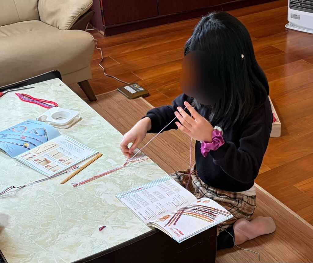 常陸太田は明日が終業式ですが、今日のえーぽいんたープラスは中学校を卒業したTちゃん、小学校を卒業したSくんと飛び入り参加のSちゃんのおにいちゃんの3人と、現役小学生Sちゃんの4人組、すでに春休みモードです。そもそも手芸好きの多いえーぽいんたー、T ちゃんが「ミサンガ」の編み方の本を持ってきたので、さっそくみんなでやってみました。