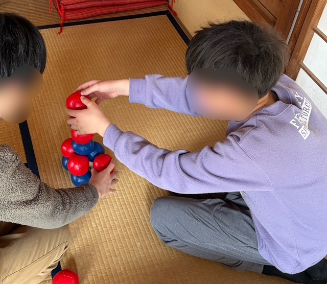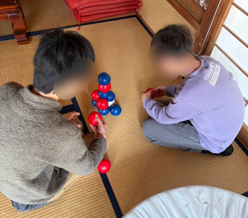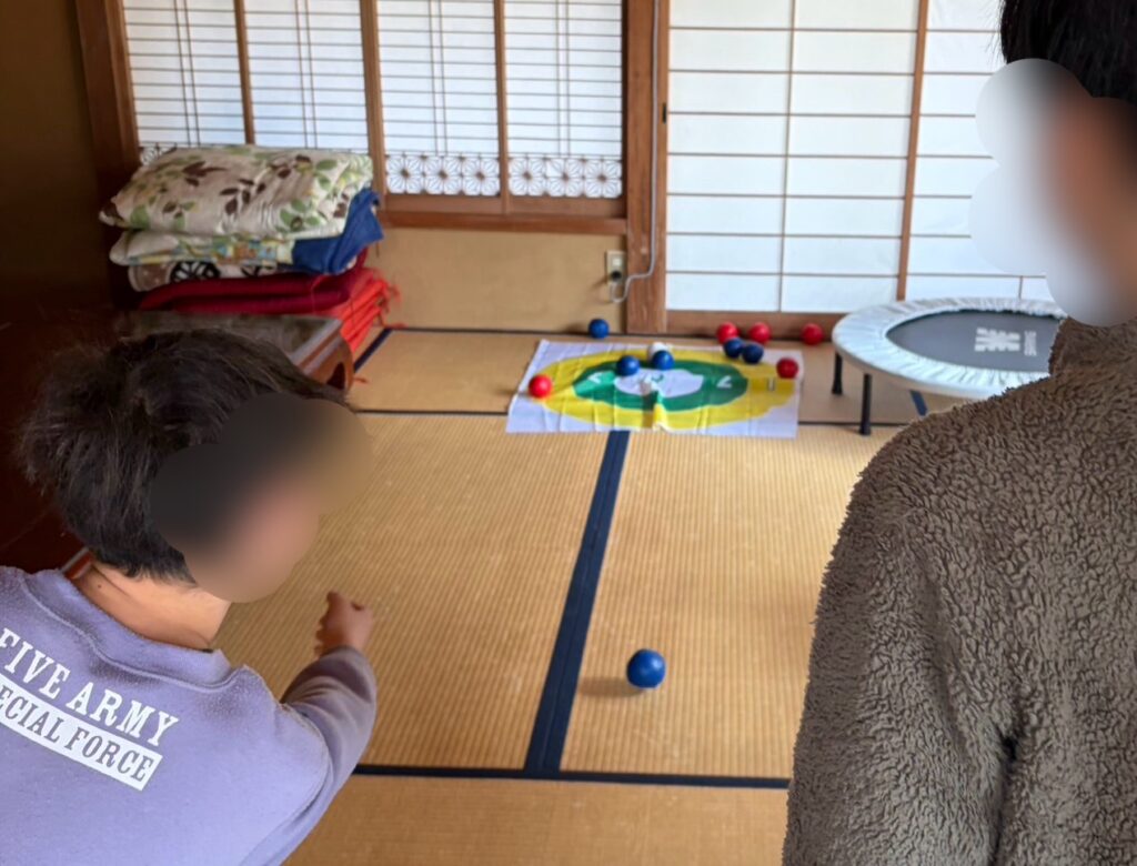 その後、この男子たち、和室においてあった「ボッチャ」を見つけて対決!写真では青のSくんが優勢の様子ですが。。