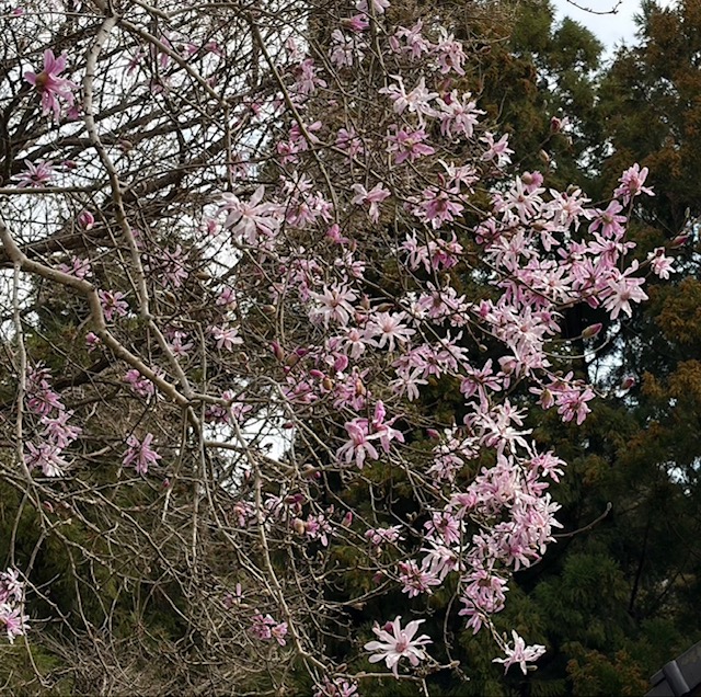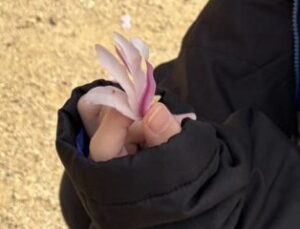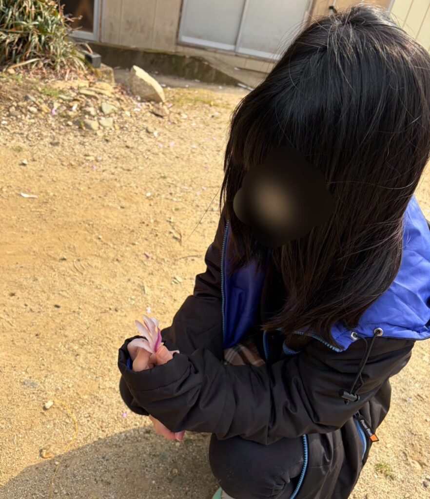 理事長ご実家のえーぽいんとは、庭にいろいろな木々があります。先日まで満開だった梅から春へのバトンを受け取ったのがヒメモクレン。満開のピンクの可愛い花たちが、春が来るよと知らせてくれています。落ちた花びらはやわらかくて、Sちゃんの手にもふわりと咲きました。