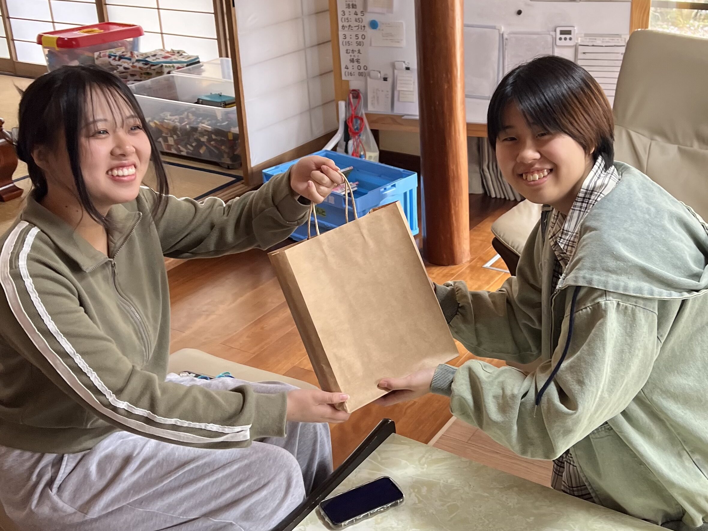 Kちゃんは今日で一区切り。えーぽいんとメンバーからの卒業プレゼントを…。代表でTちゃんから渡してもらいました。2人共,高校生活楽しんでね✨ 高校生になっても遊びにきてね〜✋